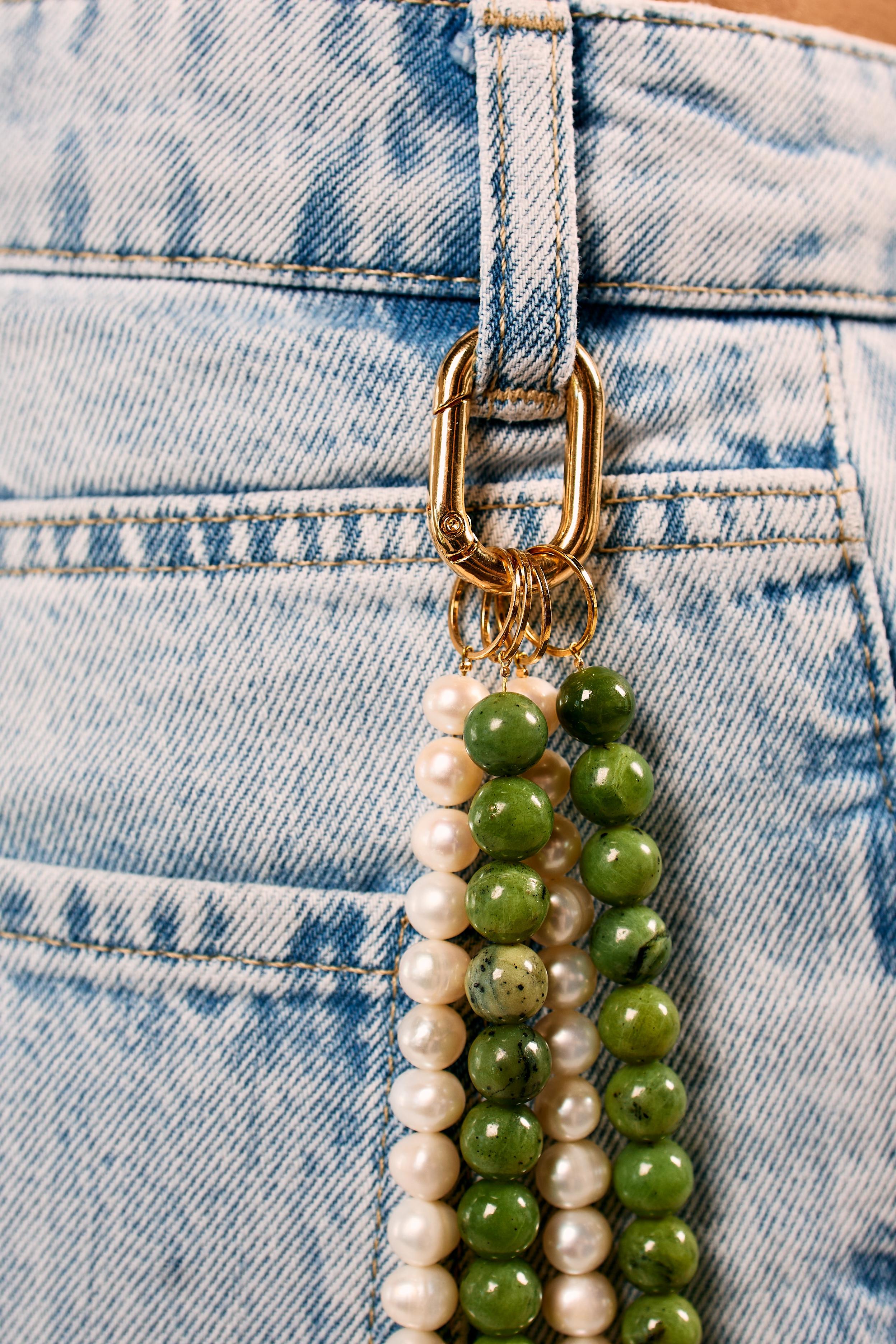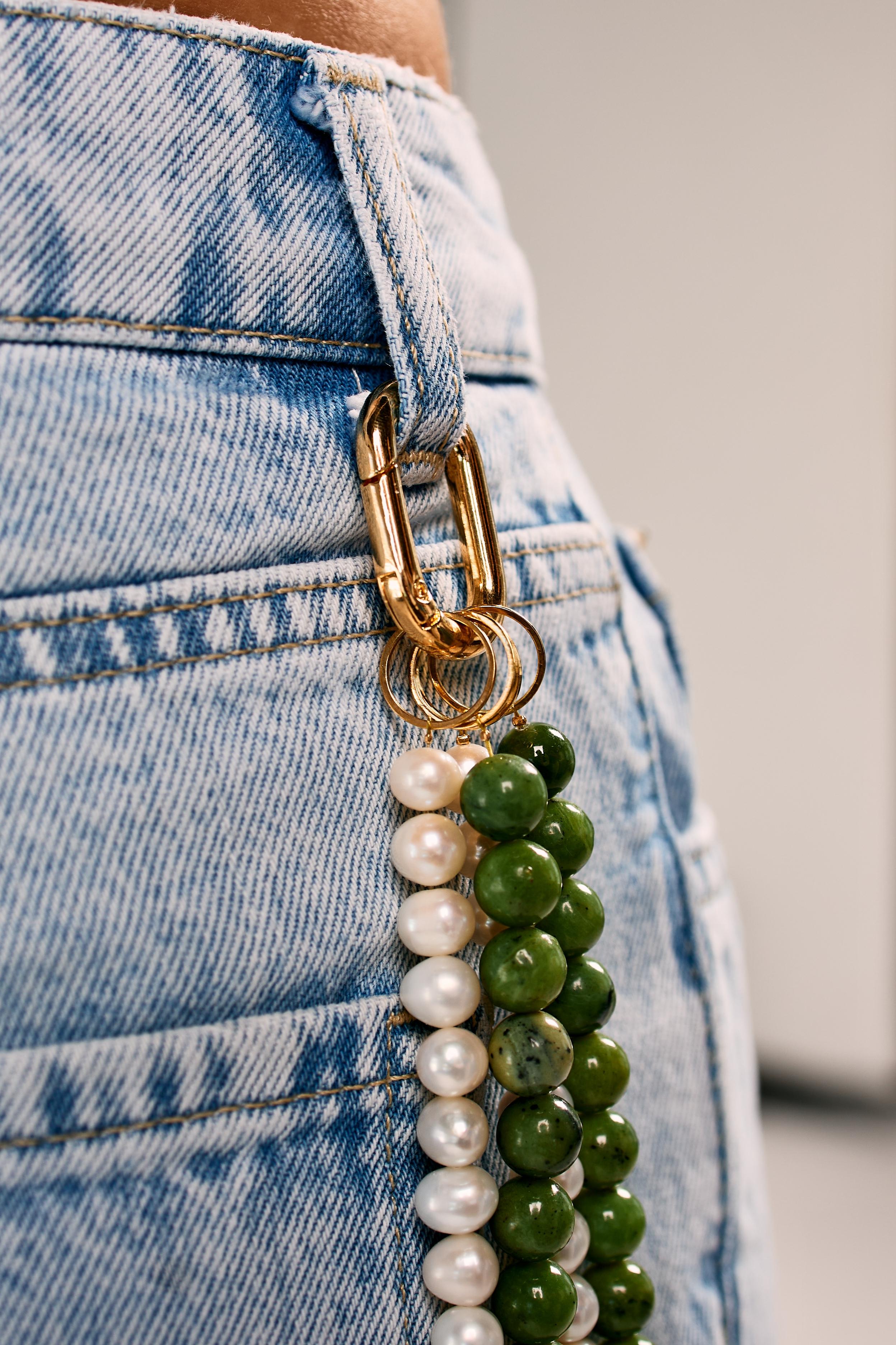 JP | Экспериментальный дуэт: • Белоснежный жемчуг — классика с мягким блеском. • Нефритовая зелень — камень мудрости и защиты. • Круглые бусины — идеальная геометрия для многослойности. 📏 Размеры: 48.5 см (включая стильный замок-акцент). Как носить: 3 жизни одного украшения: На шею — пара чокеров создаст эффект «волн». Обвес на сумку — превратит тоут в арт-объект. Аксессуар для джинс — проденьте через поясницу для дерзкого акцента. Можно приобрести отдельно, но мы рекомендуем многослойность: Жемчужный чокер: 4 500₽ Нефритовый чокер: 2 500₽