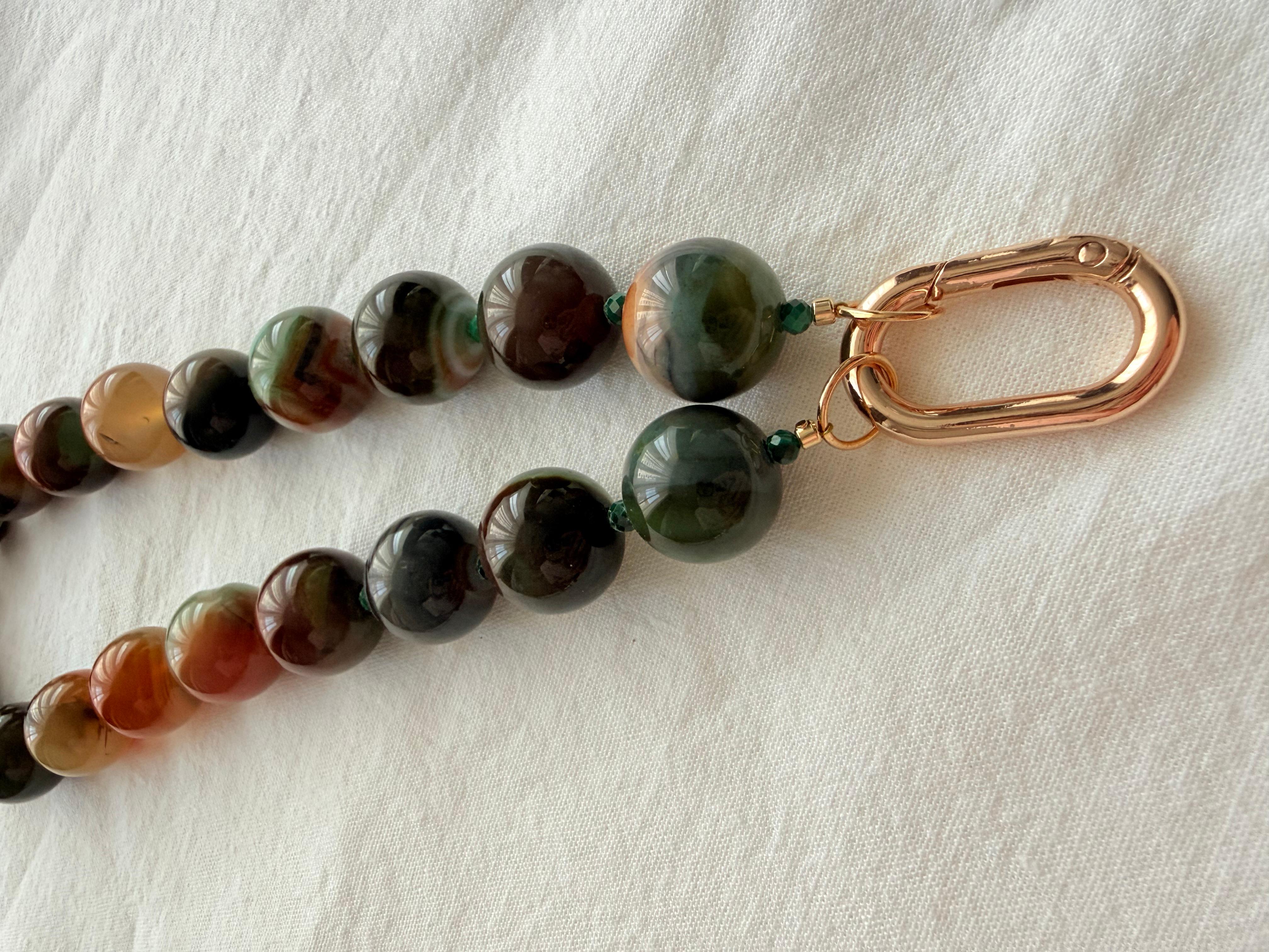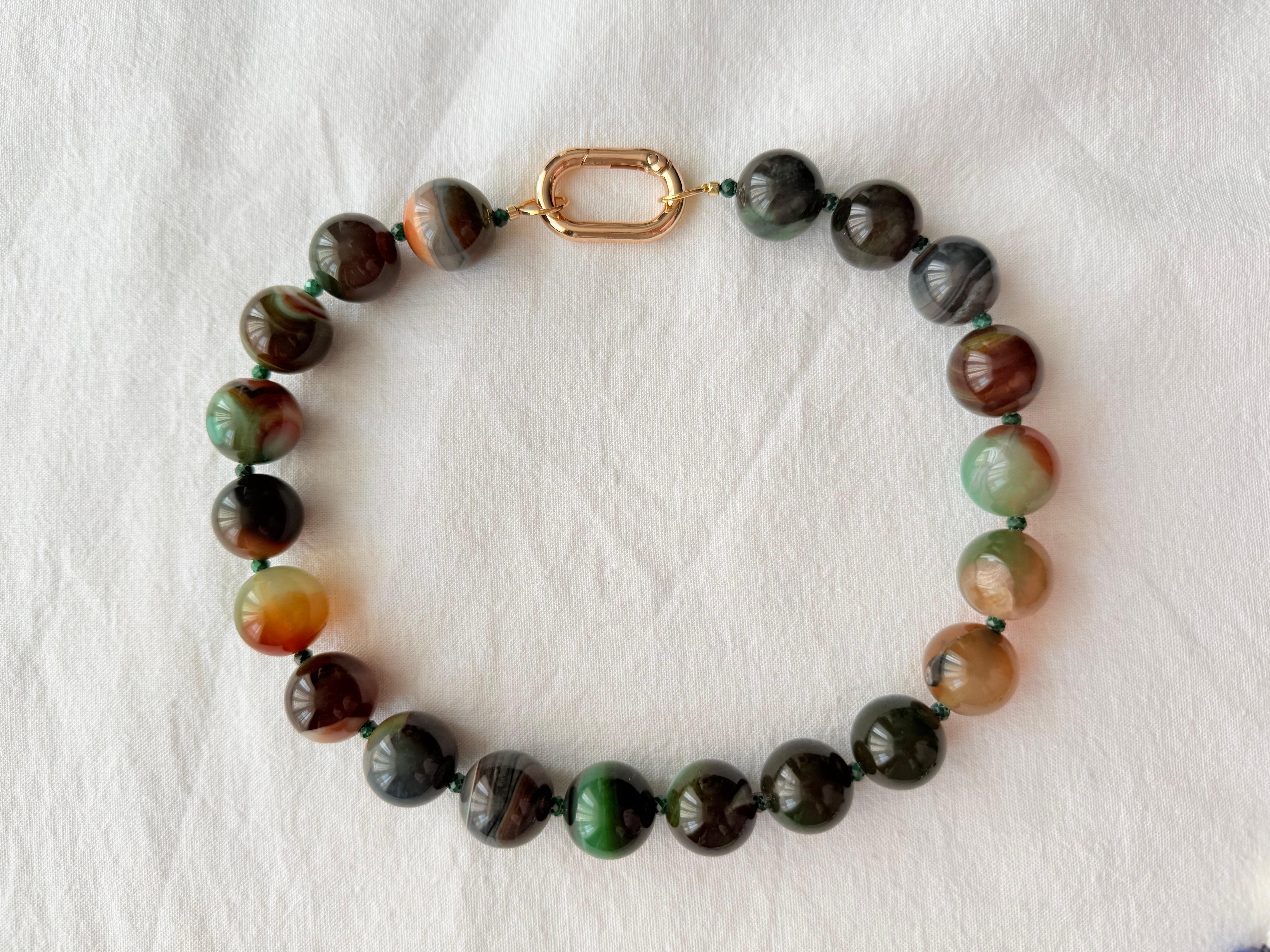 Главные герои: 1. Зеленый агат, круглой формы (бусина 2 см) 2. Глубокий зеленый малахит 3. Массивный замок с позолотой и массивная золотая цепь. Украшение с сильной, но уравновешенной энергией. 🔹Крупного размера бусины зеленого агата — камень, который приносит удачу. 🔹Акценты из малахита — в сочетании с золотом привлекает удачу 🔹Крупный замок с позолотой — не просто застёжка, а часть дизайна: добавляет благородства и блеска Ожерелье привлекает внимание с первого взгляда. Подойдёт как яркий акцент к минималистичному образу и дополнение к вечернему выходу Идеально как подарок себе или близкому человеку — тем, кто ценит красоту природы и силу символов. 📏Размеры: до 50 с учетом крупного замка