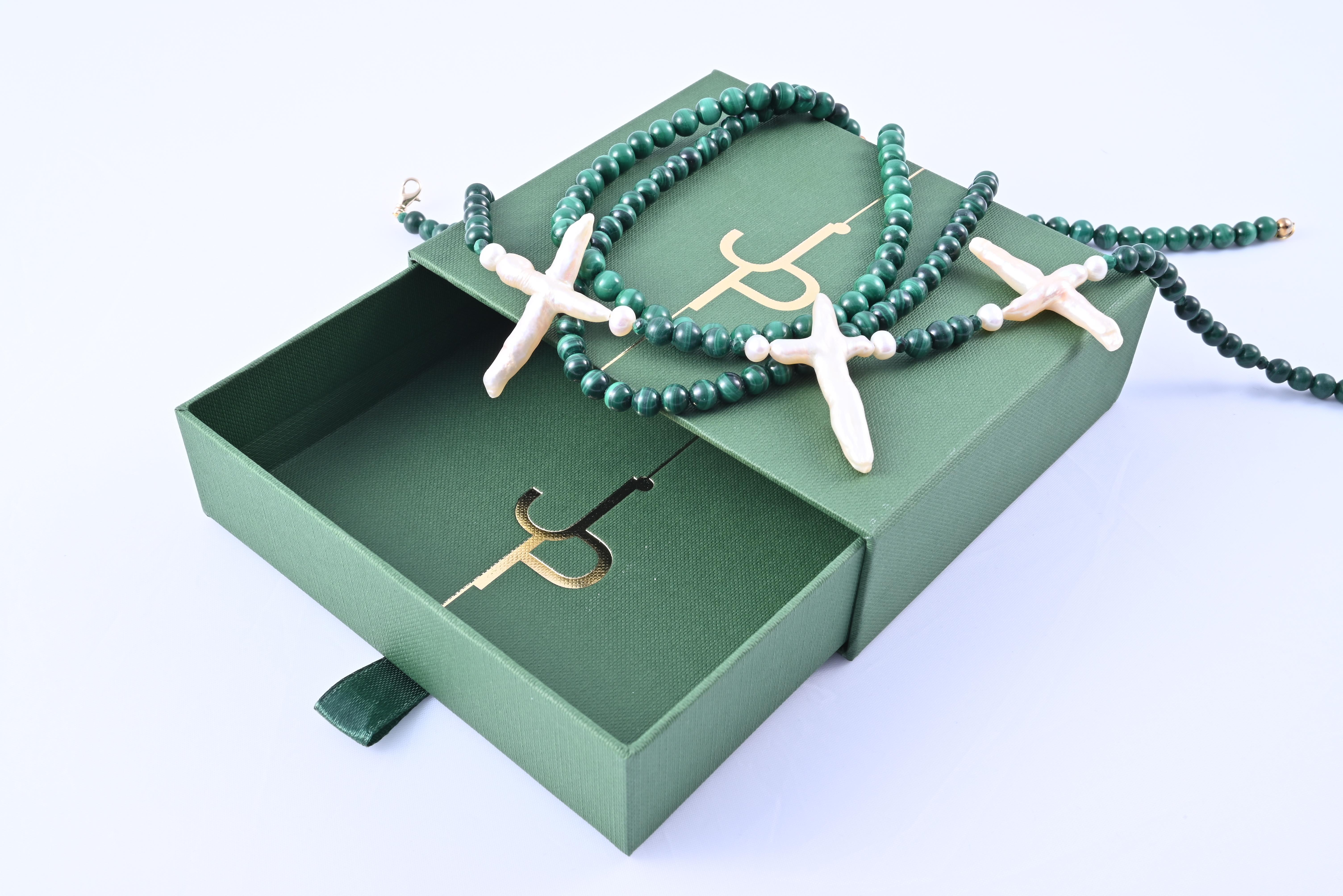 Главные герои: ▫️Малахит — камень трансформации — встречает мягкое сияние барочного жемчуга. Украшение для тех, кто ценит глубину в деталях. 📏 Размеры: • 38 см — плотное прилегание • 40 см — свободная посадка для слоёв Как носить: • Готичный шик: чёрная водолазка + кожаное пальто + чокер как акцент • Вечерний выход: с декольте — малахит играет при свете • Smart casual: поверх рубашки с острым воротником Комплект-история: Дополните образ ниткой из малахита для эффекта многослойности Стоимость указана за сет, но можно приобрести по отдельности: Чокер из малахита с жемчугом 3500 Чокер из малахита 2500