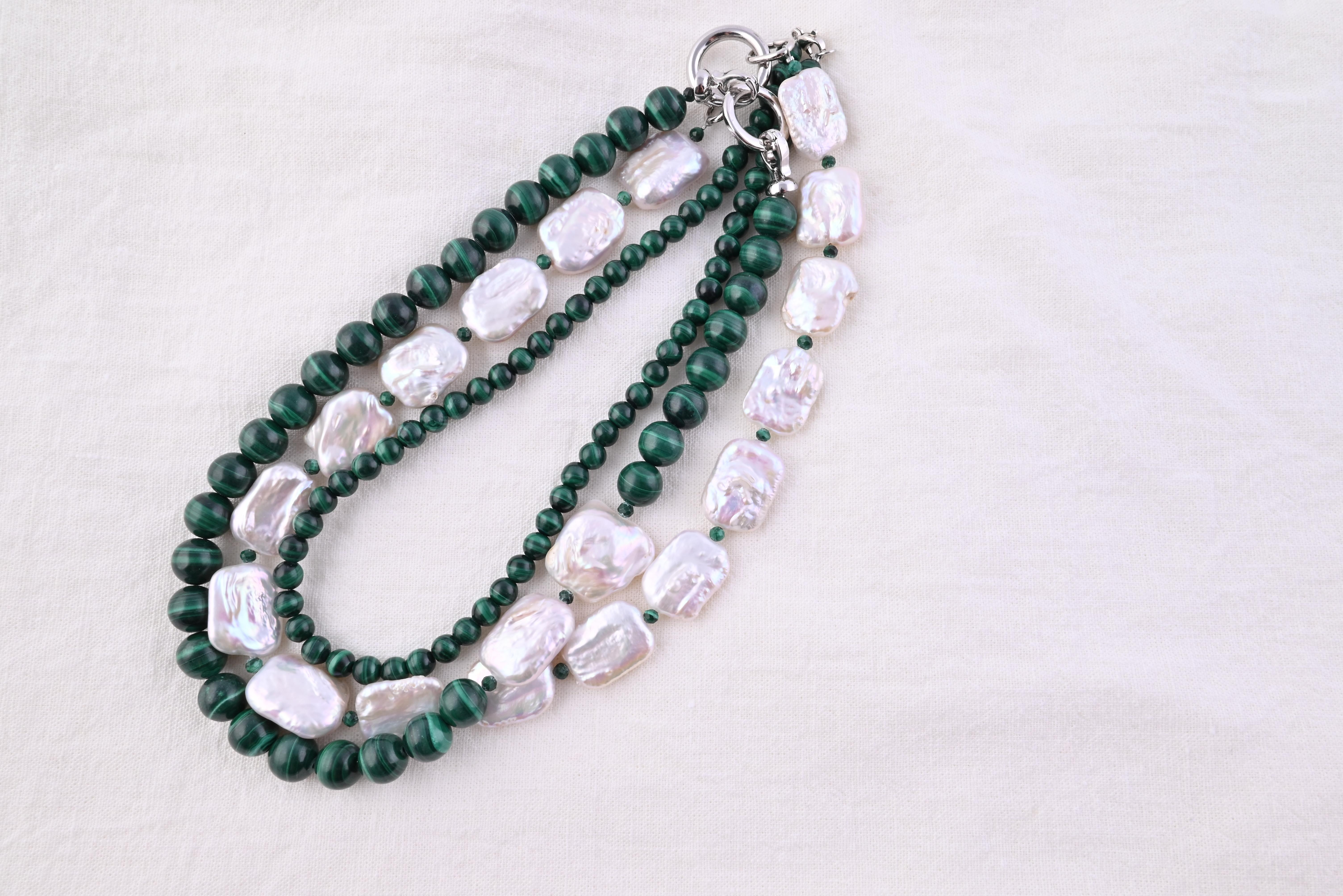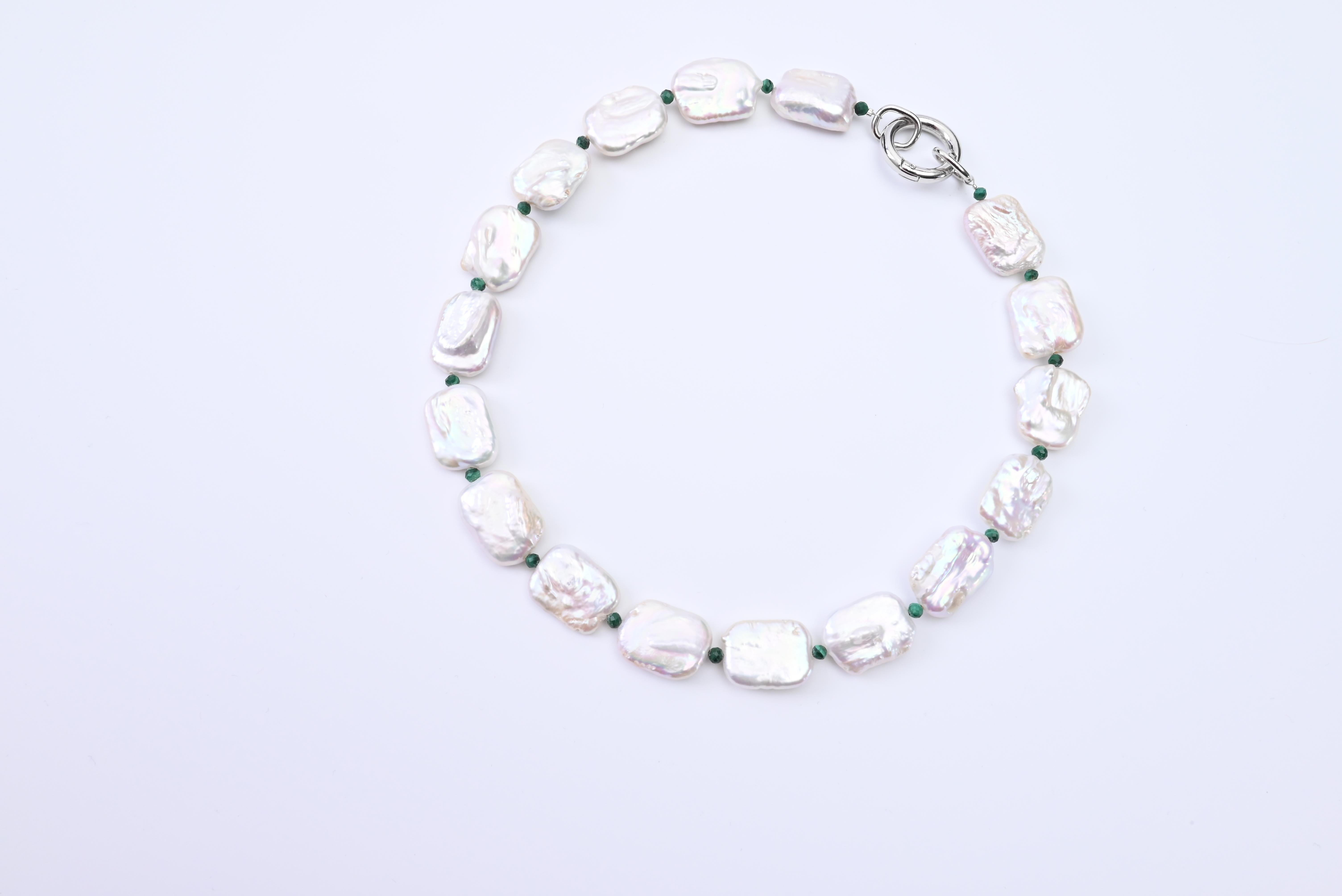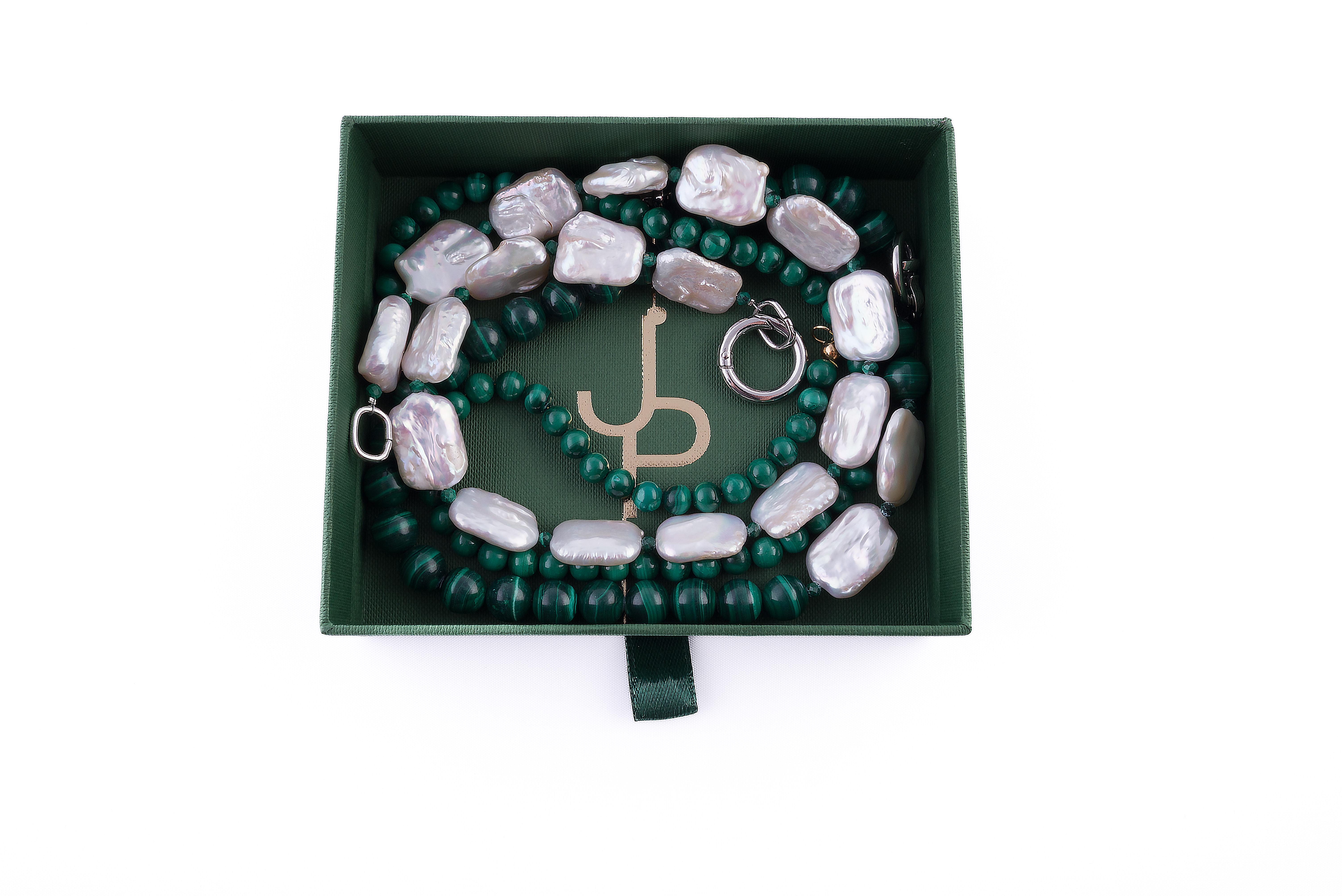 JP | Ожерелье из барочного жемчуга Чокер из квадратного жемчуга с малахитовыми бусинами Крупные квадратные жемчужины (размер каждой 2 см) и акценты из малахита между жемчужин. 📏Размер с учетом замков от 43,5 до 45 см 📏Размер с учетом массивного замка от 43,5 до 45 см. Как носить: — С белой рубашкой из хлопка, тёмно-серым блейзером, лёгкими джинсами или брюками-палаццо. — С маленьким черным платье и красной помадой. — Свитер оверсайз, юбка-макси с разрезом, кожаные ботинки на низком ходу. Для многословйности рекомендуем добавить ожерелье из крупного малахита https://jpstudio.space/item/jp-or-ozherele-iz-krupnogo-malahita-1756840209537